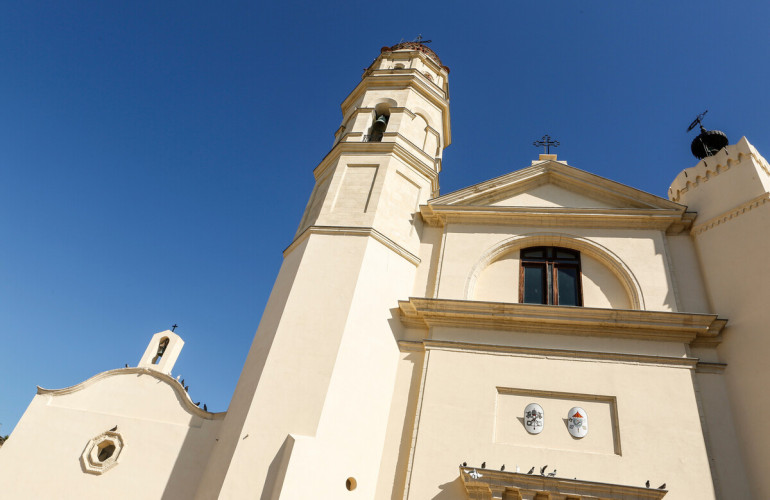 Costruita nel XII secolo in stile romanico, fu successivamente riedificata in stile gotico-catalano tra il XV e il XVI secolo. Un incendio nel 1775 distrusse gran parte della struttura, portando a una nuova ricostruzione iniziata nel 1809 e completata nel 1828 in stile neoclassico. La facciata presenta un timpano triangolare, una cornice marcapiano e due elementi distintivi: il campanile ottagonale e la torre dell’orologio.